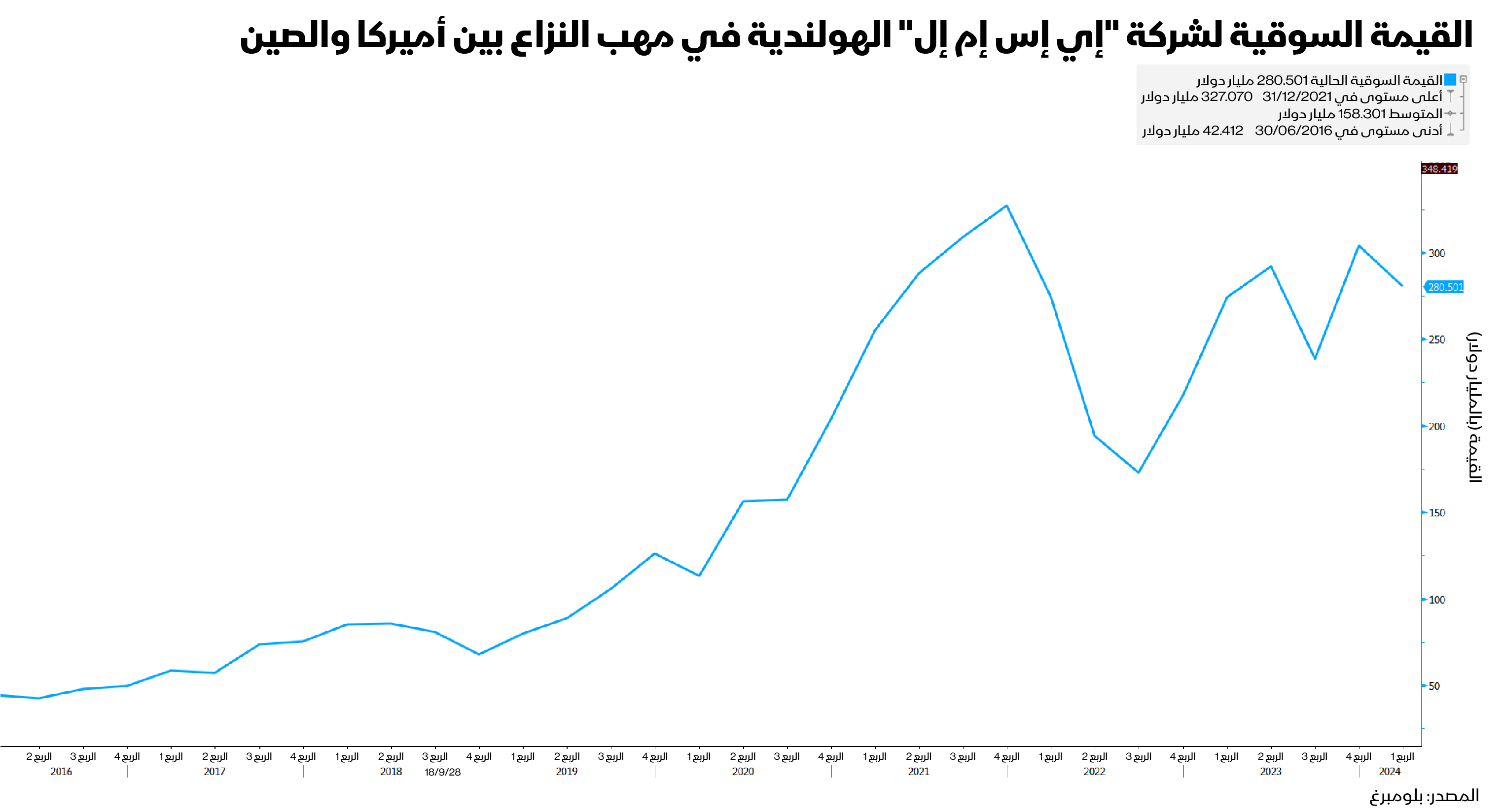 يأتي القرار الأخير بمنع تصدير آلات الـ(EUV) للصين كآخر حلقات المواجهة بين الصين وأميركا. وفي حين لم يتضح بالضبط عدد الآلات وطرزها التي تصدرها الشركة للصين، إلا أن أسهمها تأثرت لحظياً بهذا القرار، وقدر بعض محللي بلومبرغ أن مبيعات الشركة ستتراجع في حدود 5% خلال 2024، وقد تظل إيراداتها مساوية للعام 2023 عند 27 مليار دولار، كما قد يتراجع الطلب على آلات الـ(DUV) التي تنتجها.