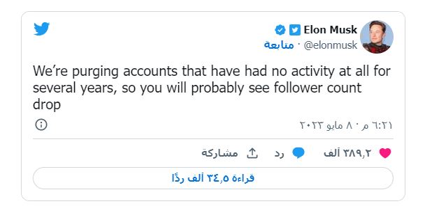 أعلن إيلون ماسك، الرئيس التنفيذي لشركة “تويتر”، في تغريدة يوم الإثنين أن الشركة ستحذف الحسابات التي لم تكن نشطة لعدة سنوات، وأن هذا قد يؤدي لانخفاض عدد المتابعين.