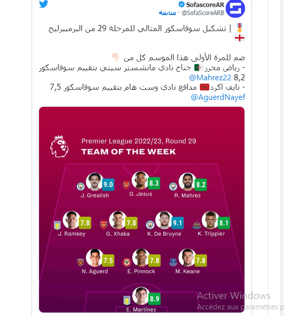 تواجد الدولي الجزائري رياض محرز ضمن التشكيلة المثالية للجولة الـ29 من الدوري الإنجليزي الممتاز حسب تصنيف قام به موقع “سوفاسكور”.