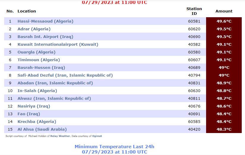و في آخر تحديث له أكد موقع “Eldoradowheather” أن حاسي مسعود تتصدر قائمة المدن الأكثر حرا بدرجة حرارة وصلت إلى 49.6 درجة مئوية تلتها مدينة أدرار والتي بلغت درجة الحرارة فيها 49.5 درجة مئوية.