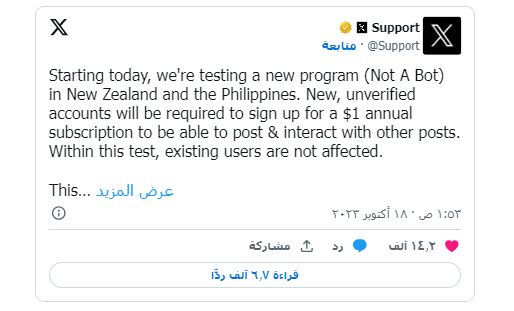 أضاف حساب الشبكة، في منشور يوم الثلاثاء، أن الاختبار الذي أطلقت عليه اسم “Not a Bot” أو ما يعني “ليس روبوتاً” طُرح بالفعل في نيوزيلندا والفلبين. ولن يتمكن المستخدمون الجدد الذين لا يدفعون الرسوم من اتخاذ إجراءات معينة على الموقع دون اشتراك، بما في ذلك كتابة المنشورات أو الإعجاب أو الرد أو وضع إشارة مرجعية.