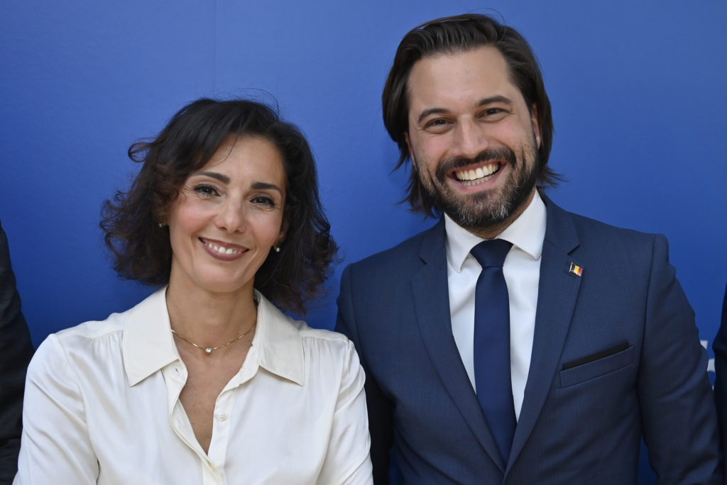 Newly presented Foreign minister Hadja Lahbib and MR chairman Georges-Louis Bouchez pose for the photographer at the oath ceremony of Labib, who will become the new Foreign Minister replacing Wilmes, at the Royal Palace, Friday 15 July 2022, in Brussels. Labib, a former journalist, replaces Wilmes, who has resigned from her function.