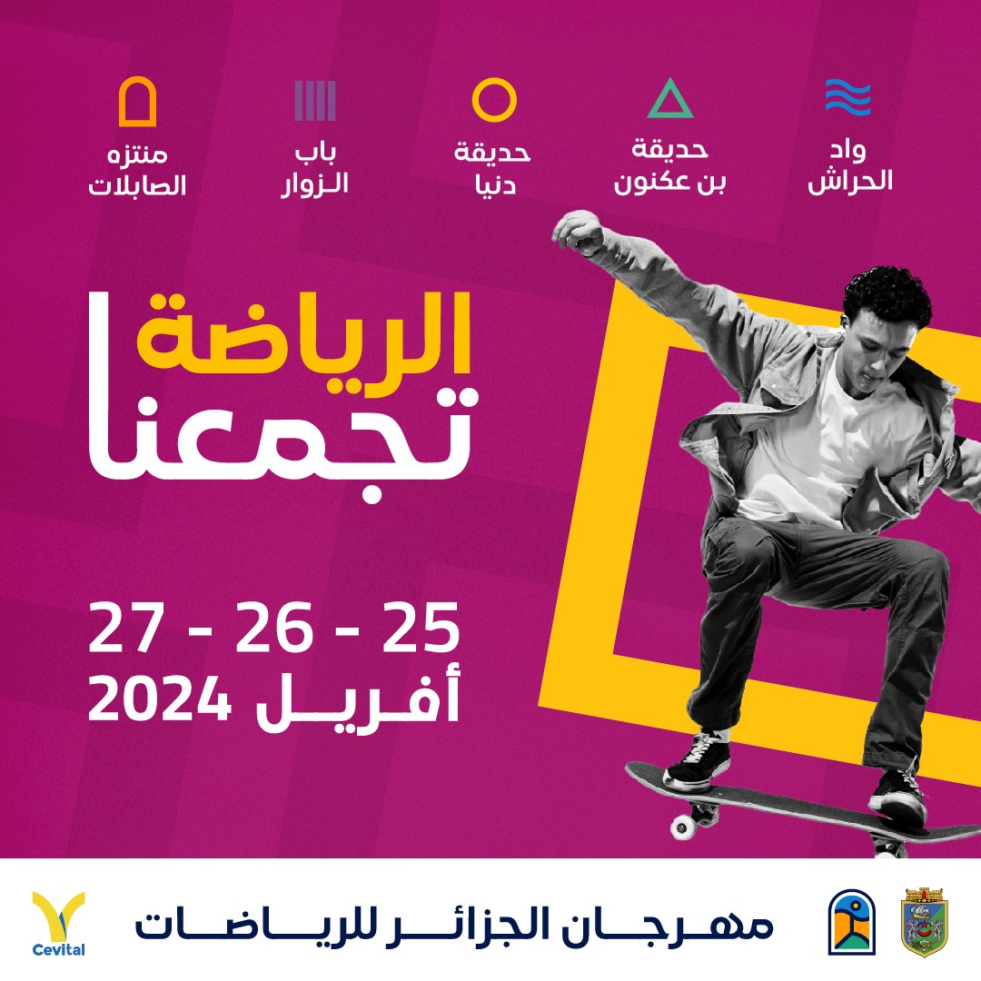 تحتضن ولاية الجزائر في الفترة الممتدة بين 25 الى 27 أفريل مهرجان الجزائر الأول للرياضات عبر خمسة مواقع، يشمل 70 نشاطا رياضيا موجها لمختلف الأعمار، يتوقع أن يستقبل مليون زائر. وتهدف التظاهرة الرياضية التي تحمل الصبغة الإيكولوجية والبيئية، إلى ترقية النشاطات الرياضية.