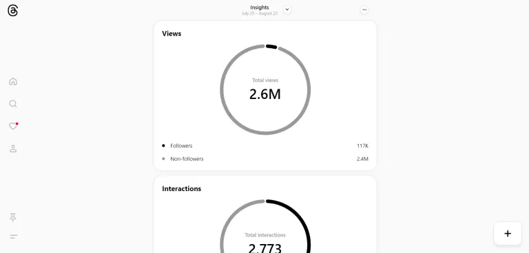 عبر ميزة إحصائيات ثريدز يمكنك التعرّف على وصول منشوراتك وكيف يتفاعل معها الجمهور على التطبيق، بالإضافة إلى بعض المعلومات الديموغرافية، مثل نسبة الرجال مقابل النساء من المتابعين، والفئات العمرية.