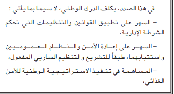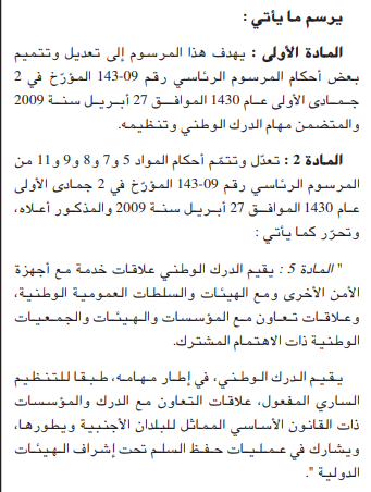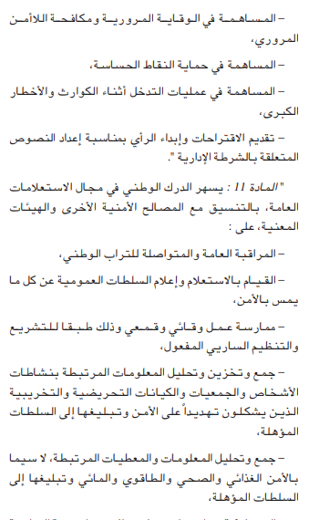 وأسندت للدرك الوطني مهام جديدة، على غرار مكافحة التخريب وكل الأنشطة الرامية إلى المساس بأمن الدولة، المساهمة في مهام الاستعلامات العامة والمساهمة في تنفيذ الإستراتيجية الوطنية للأمن الغذائي.