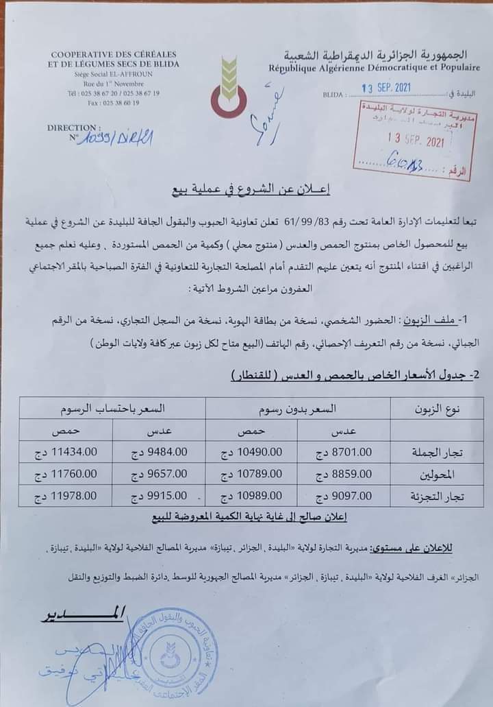 وأوضحت التعاونية في إعلانها أن العرض موجه لتجار الجملة والتجزئة وأيضا للمحولين،شريطة استظهار نسخ من السجل التجاري ومراعاة شروط أخرى. وجاء في الإعلان أن العرض مفتوح أمام كافة تجار الجملة والتجزئة والمحولين من جميع ولايات الوطن.