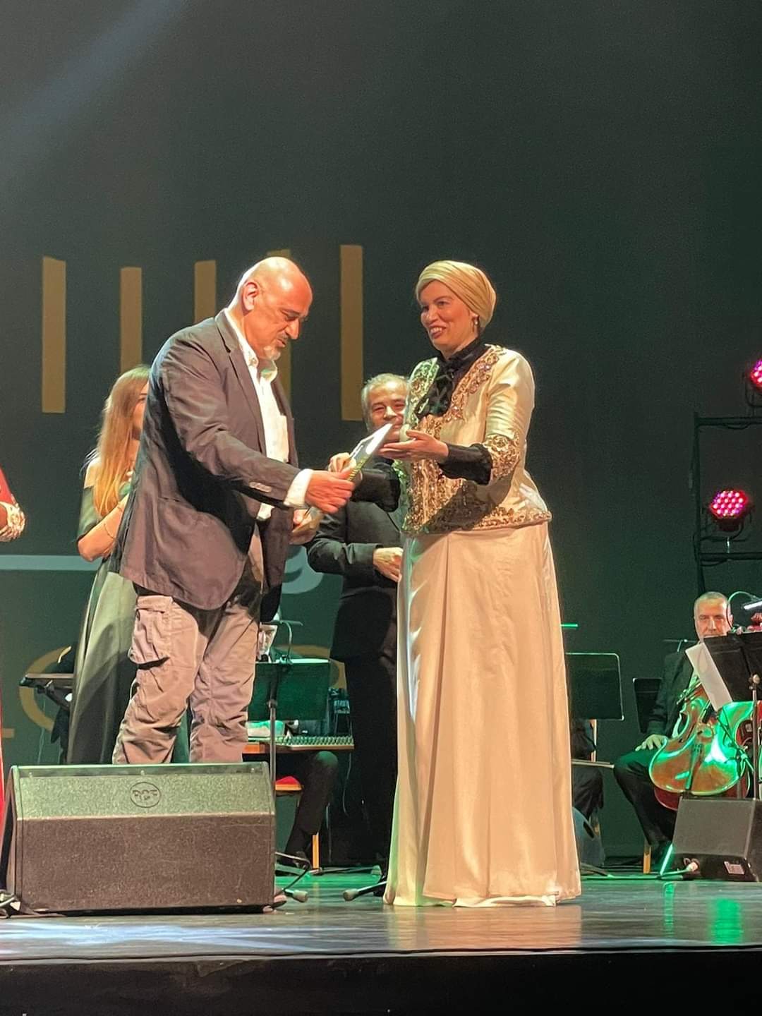 لتقوم الدكتورة صورية مولوجي في نهاية الحفل بتكريم عائلة الفنانة المُحتَفَى بها مُمثَّلَة في إبنها، داعية فناني الجيل الحالي إلى السير على نفس النهج والأثر.
