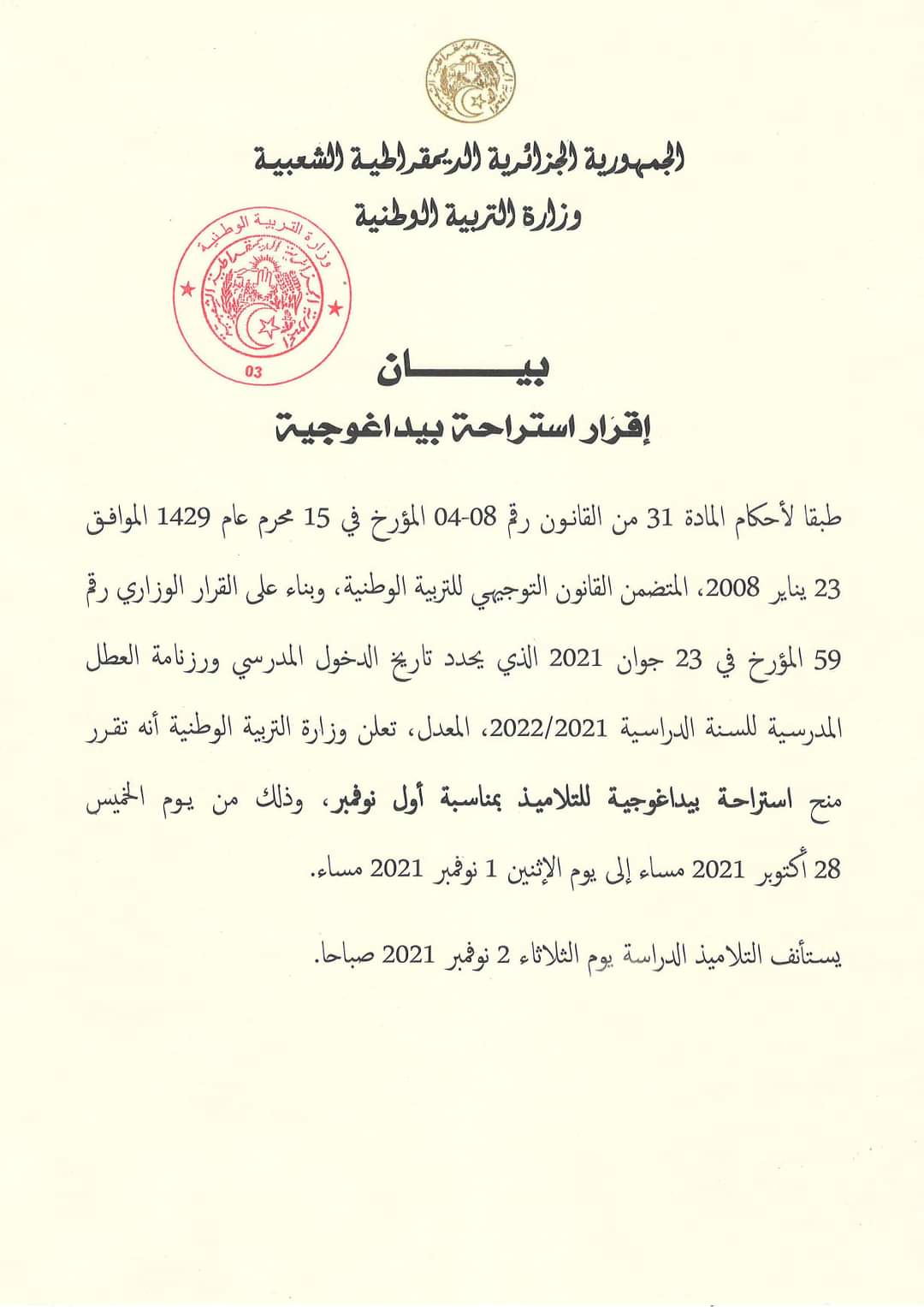 وزارة التربية: عطلة استثنائية للتلاميذ بمناسبة أول نوفمبر وزارة التربية: العطلة البيداغوجية تبدأ من مساء غد الخميس إلى غاية الاثنين القادم وزارة التربية: التلاميذ يستأنفون الدراسة صبيحة يوم الثلاثاء 2 نوفمبر.
