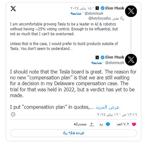 كتب “ماسك” في أحد منشوراته على “إكس”: “يتعلق هذا في المقام الأول بضمان الدرجة المطلوبة من التأثير على قرار التصويت في (تسلا)”.
