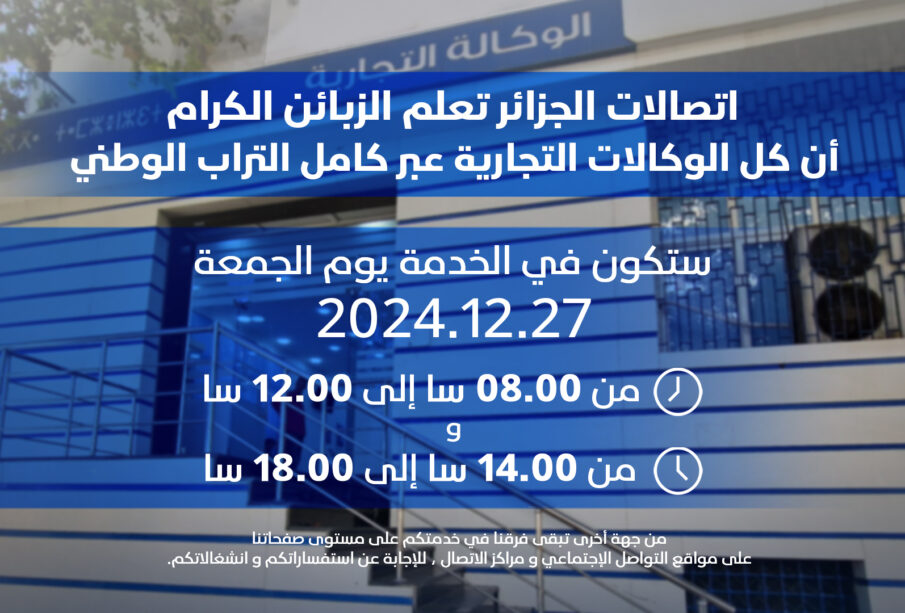 Soucieuse de répondre favorablement aux attentes de ses clients, Algérie Télécom annonce l’ouverture exceptionnelle de ses agences commerciales sur l’ensemble du territoire national ce vendredi 27 décembre 2024, à l’occasion de cette fin d’année.