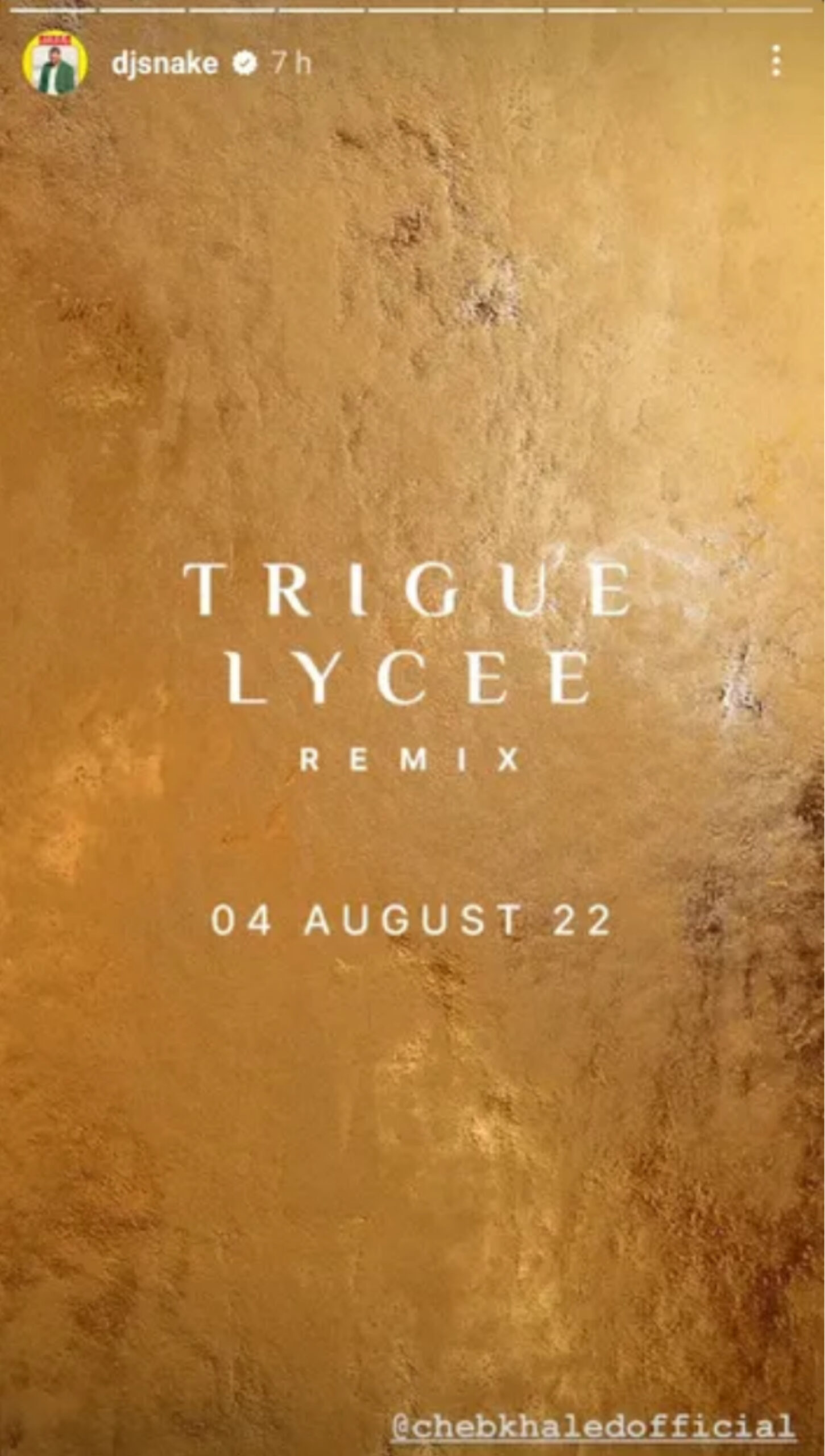 Au plus grand bonheur des fans de Cheb Khaled, DJ Snake travaillera le célèbre morceau de « Trigue Lycée ». En ce qui est de la date de son lancement, le chef-d’œuvre verra le jour le jeudi 4 août prochain, annonce la star planétaire de l’électro.