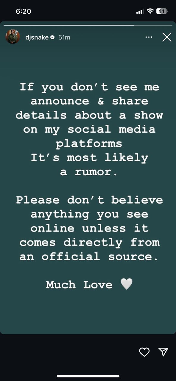 Des rumeurs concernant l’annulation du concert de DJ Snake, prévu le 22 août 2025 au Stade Nelson Mandela d’Alger, circulaient sur les réseaux sociaux. Cependant, l’artiste franco-algérien vient de démentir ces informations via une story publiée sur son compte Instagram.