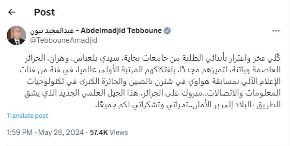Le président de la République, Abdelmadjid Tebboune, a tenu à féliciter personnellement les étudiants pour leurs exploits. Il a exprimé sa grande fierté sur les réseaux sociaux : « Très fier de nos chers étudiants des Universités de Béjaïa, Sidi Bel Abbès, Oran, Alger et Batna pour cette nouvelle distinction. Ils ont décroché la première place mondiale dans une des catégories de l’informatique et le grand prix des technologies de l’information et de la communication. »