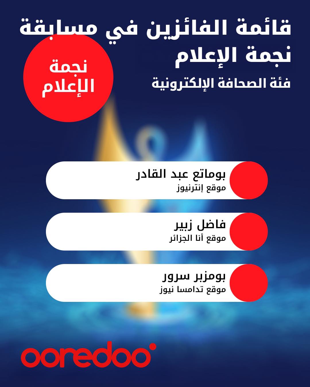 وأسفرت نتائج المسابقة، عن تتويج رئيس تحرير الموقع الإلكتروني ” أنا الجزائر “، زبير فاضل، بالجائزة الثانية في فئة الإعلام الإلكتروني، للمرة الرابعة ليؤكّد تربّعه على عرش الصحافة الإلكترونية في الجزائر.