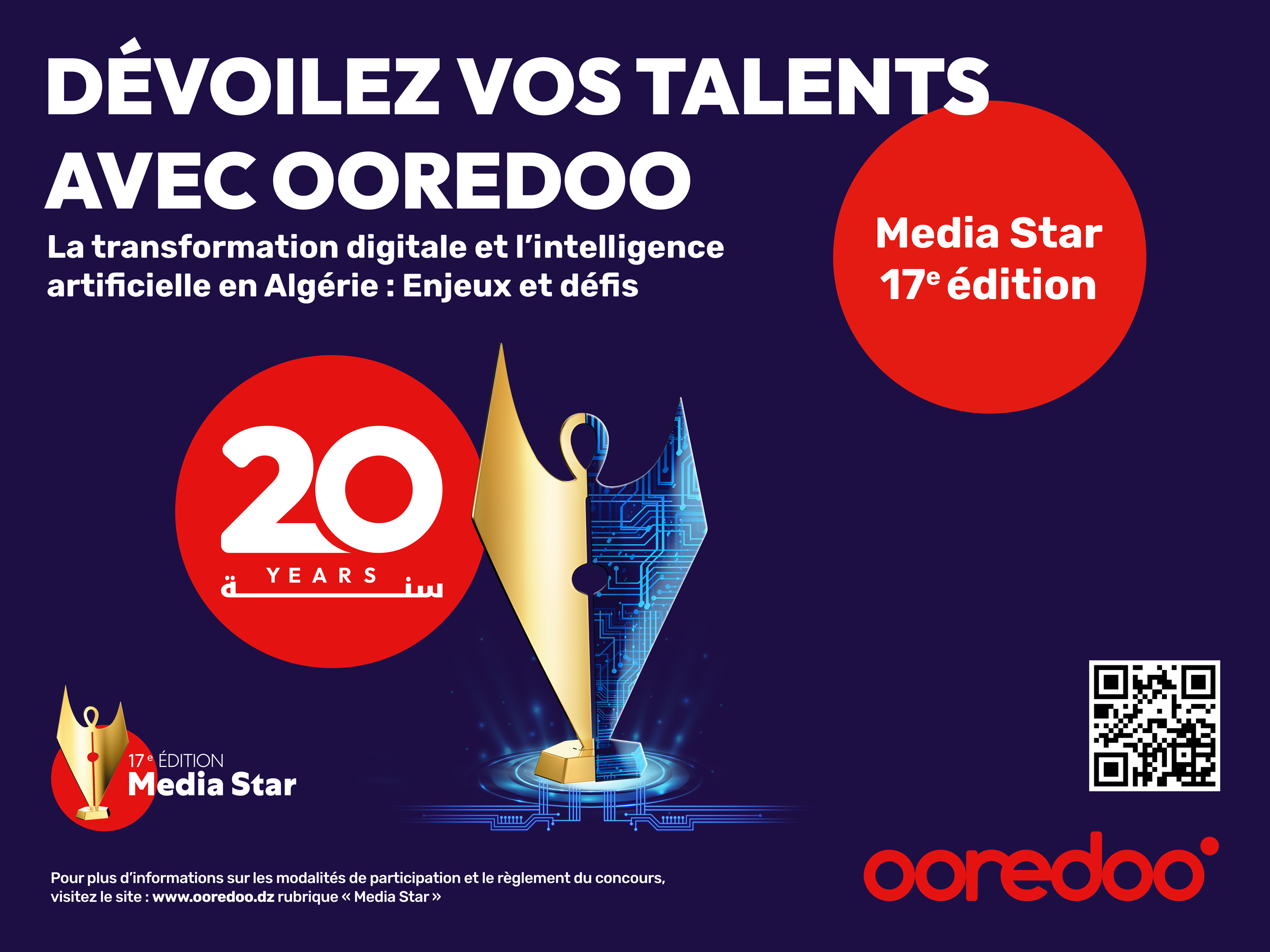 وتتناول هذه الطبعة السابعة عشر من المسابقة، والتي تتزامن هذه السنة مع الاحتفال بالذكرى العشرين لتأسيس Ooredoo في الجزائر، موضوع الساعة وهو: “التحول الرقمي والذكاء الاصطناعي في الجزائر: رهانات وتحديات”. الذي يتطابق تمامًا مع الاستراتيجية الرقمية لـ Ooredoo ومع النظام الرقمي في الجزائر.