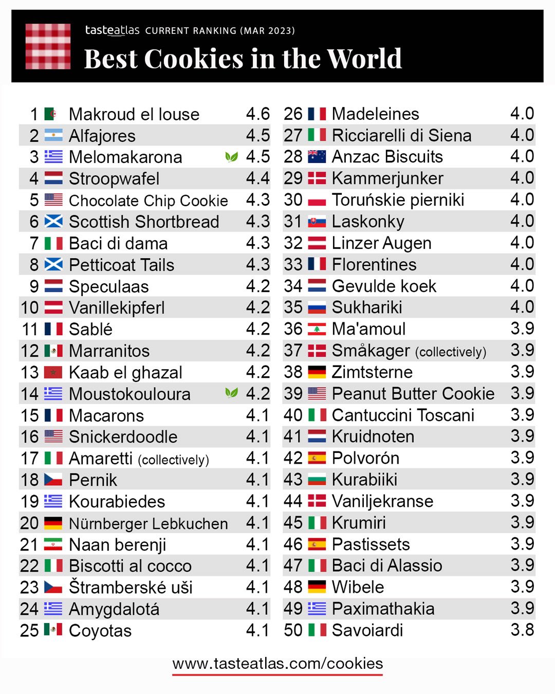 Selon cette édition de mars 2023, relayée par le spécialiste sur son compte twitter le Makrout El louz a une note de 4,6 sur 5. Il est suivi par les Alfarojes (Argentine) et les Melomakarona (Gréce) qui ont tous deux, obtenu la note de 4,5/5.